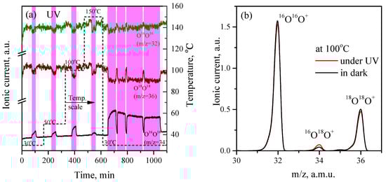 (a) MS analysis of the content of oxygen molecules with various isotopic compositions (16O16O, 32 a.m.u.; 16O18O, 34 a.m.u.; 18O18O, 36 a.m.u.) in the carrier gas passed through the cell with ZnO tablets and the effect of UV irradiation on its concentration at temperatures of 30, 50, 100, and 150 °C. After sample cooling, the effect of enhancement of POIE at room temperature is observed. (b) Mass spectrum of the carrier gas in the range of 30–37 a.m.u. at 100 °C in dark and under UV irradiation (350th and 400th minutes of the experiment in (a)).