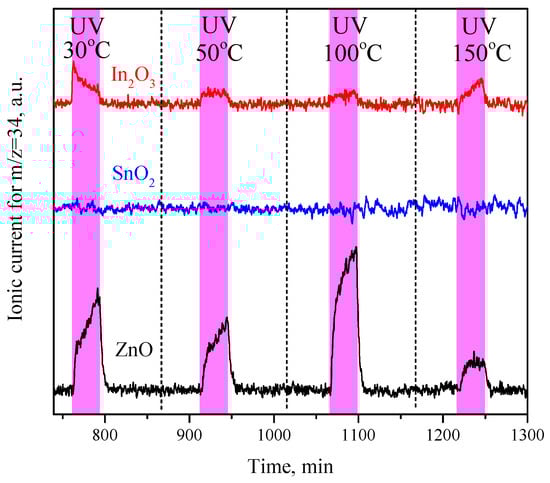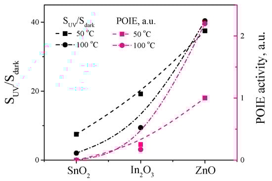 The comparison of the results of the MS and gas-sensing measurements suggests that there is a correlation between the POIE activity of the metal oxide and the photoactivated sensor response to oxygen (Figure 9). ZnO shows the highest POIE activity and UV irradiation also most evidently enhances its sensor response to oxygen; on the contrary, SnO2 does not show POIE activity and it is also characterized by the lowest sensor signal to oxygen and has the least effect of UV irradiation on it. In2O3 occupies an intermediate position, demonstrating slight POIE activity and both a moderate sensor response to oxygen and the mean effect of UV irradiation on it.