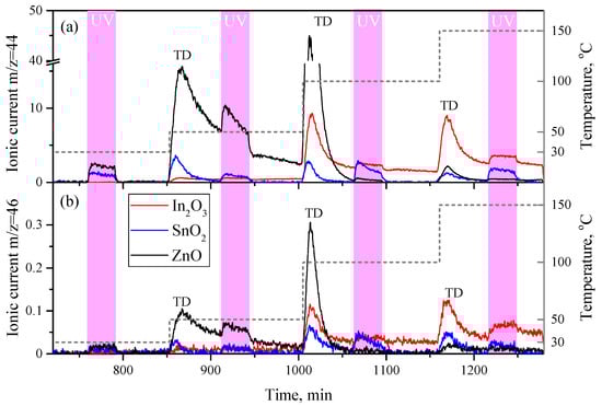 MS analysis of the content of carbon dioxide molecules C16O16O (44 a.m.u.) (a) and C18O16O (46 a.m.u.) (b) in the carrier gas passed through the cell with metal oxide tablets (ZnO, In2O3, SnO2) and the effect of UV irradiation on their concentration at temperatures of 30, 50, 100, and 150 °C. (a) is broken on the intensity axis from 16 to 40 a.u. Thermally activated desorption of CO2 is marked by “TD” symbols.