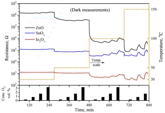 Figure 6 shows the electrical response of the nanocrystalline ZnO, SnO2, and In2O3 to oxygen in the range of 0.2–3.2 vol.% in dark conditions at temperatures of 30, 50, 100, and 150 °C. The oxygen was supplied to the nitrogen flow by pulses lasting 15 min with a distance between pulses of 30 min with an increasing concentration.