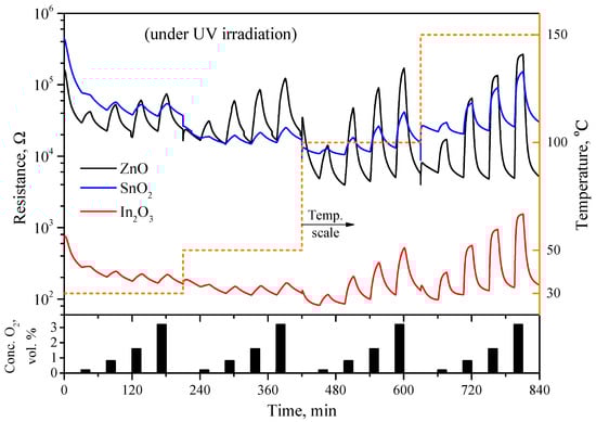 The effect of UV irradiation on the electrical response of nanocrystalline ZnO, SnO2, and In2O3 to oxygen is shown in Figure 7. It can be seen, firstly, that UV irradiation leads to a significant drop in the baseline resistance of the sensors in a nitrogen atmosphere, to for the ZnO and SnO2 and up to for the In2O3. Moreover, even at room temperature, there is a significant sensor response to the oxygen and a decrease in the response and recovery times. Simultaneous heating to 150 °C and UV irradiation lead to an increase in the sensor signal of the samples compared to dark conditions at the same temperature. Both in the dark and under UV irradiation, the resistance of ZnO-, SnO2-, and In2O3-based sensors increases in the presence of oxygen relative to the base resistance in nitrogen, which implies a typical response of an n-type semiconductor to an oxidizing gas.