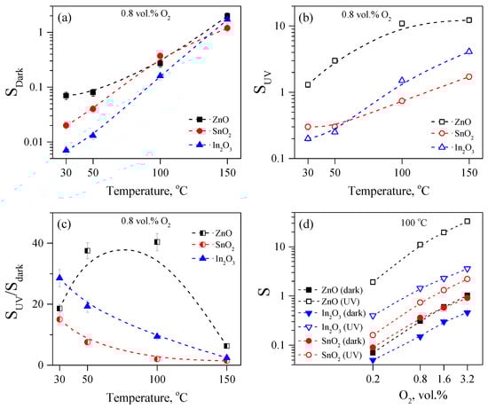 UV irradiation leads to different effects on the sensor signal for three other metal oxides. Figure 8a shows the temperature dependence of the sensor signal to 0.8% oxygen in the dark (). It can be seen that the ZnO-, SnO2-, and In2O3-based gas sensors demonstrate a small, close-to-each-other sensor signal in a temperature range of 30–150 °C. With an increasing temperature, the sensor signal increases; in semilogarithmic coordinates, a dependence close to linear is observed, the slope of which is approximately the same for all three oxides.