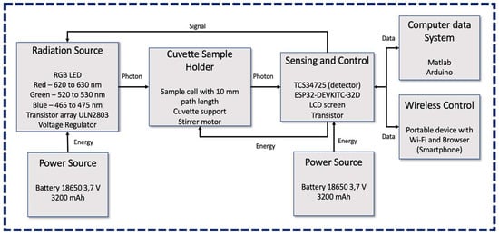 A block diagram showing the main components of the IMS device developed for colorimetric determination of Fe2+ in fresh water is presented in Figure 1. The flow of the radiation, data, energy, and control signal are presented as well. The radiation source module is equipped with a general-purpose red, green, and blue (RGB) LED, a Darlington transistor IC (UNL2803) for selection of the LED emitting channel, and a voltage regulator to maintain constant voltage coming from the energy source. The power source module for this block consists of 2 batteries of 3.7 V with 3200 mAh each. The cuvette sample holder can accommodate a cuvette of 10 mm path length containing the water samples being measured, and a stirrer motor was introduced to investigate its efficiency in shaking solvents and reagents.