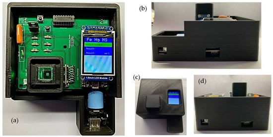 Aiming to reduce voltage fluctuations and maintain better stability of the emitted radiation, a second power source module, independent and with the same features as the first one, supplies the sensing and control bloc, which accommodates the RGBC TCS34725 sensor. The sensor has 4 channels, RGB and clear, with a dynamic range of 3,800,000:1 and an IR filter that almost blocks the detection after 700 nm; i.e., the blue, green, and red channels have maximum sensitivity at 475, 550, and 620 nm with FWHM of 104, 79, and 55 nm, respectively. The clear channel ranges from 300 to 700 nm. The RGBC sensor has 4 integrated ADCs that allow the amplified photodiode current to be converted into digital 16-bit values. The sensor works with voltage of 3.3 V and current of 235 µA. The signal gain can be set at 1X, 4X, 16X, and 60X. Integration time ranges from 2.4 to 614 ms. The sensing and control module also includes the ESP32-DEVKITC-32D microcontroller, which drives the RGB LED and the stirrer motor, allowing for temporary storage of the data coming from the TCS34725 sensor, and an LCD screen to show the measurement results to the user. The ESP32 and screen are assembled in a double stack configuration, allowing us to decrease the size of the instrument. The computer data system is simply a personal computer (PC) linked to the IMS through a USB connection, and the PC is equipped with Arduino software for programming the ESP32 board and developed MATLAB scripts for storing and processing the data. The wireless control block can be any device with standard Wi-Fi IEEE 802.11 communication and a browser to interact with a web page stored in the microcontroller. The portable device allows access to a built-in web page to set the blank water sample in the beginning of the measurement operation, then record the iron concentration and activate the stirring motor. The final version of the IMS without the upper cover for demonstration purposes is presented in Figure 2a. The right-side view of the instrument (Figure 2b) shows the two engraved entrances to charge the first power supply and the button to turn the sensing and control modules on and off. Figure 2c shows the upper view of the instrument with the top cover and the cuvette cap. Finally, Figure 2d shows the back side view of the instrument with two engraved holes to charge the second power supply and a switch to turn the RGB diode on and off. The device also includes a button to set the measurement of the blank sample and perform measurement of water samples containing Fe2+.