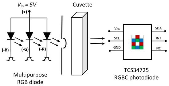 Diagram of common anode photon-emission controlled by transistor matrix and cuvette, and representation of RGBC TCS34725 photodiode.