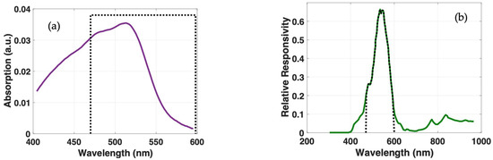 (a) Absorption spectrum of ferroin with maximum absorption wavelength at 514 nm and integration area by superposition of spectral range 470–600 nm (dashed black line); (b) overlap of wavelength ranges of photodiode (green line) with radiation emitted from green channel of RGB LED (dashed black line) with highest spectral response at 525 nm.
