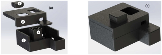 (a) Explosion view of 3D enclosure implemented to receive electronic components; (b) rendering of device closed for demonstration purposes.