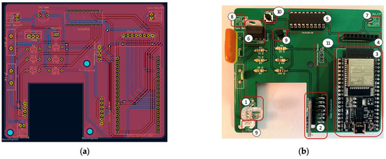 (a) Schematic view of developed PCB; (b) front view of physical PCB with main electronic components assembled.
