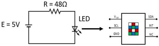 For better characterization of the photon source, sensitivity analysis based on a statistical approach was carried out. The integrated intensity of the radiation emission between wavelengths of 470 and 600 nm coming from the green channel of the RGB LED was measured as illustrated in Figure 7. The LED was supplied at 5 V with load resistance of 48 Ω for the green channel, and a TCS34725 photodiode was used to quantify the radiation reaching the sensor.