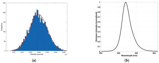 (a) Normal error curve distribution for green channel of diode, 5000 measurements (blue bars), and best fit of distribution (red line); (b) spectral energy distribution of RGB LED green channel with a peak at 520 nm.