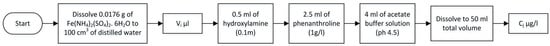 Flowchart for Fe2+ standard solution preparation using phenanthroline. Vi denotes volume of iron solution necessary to prepare standard sample with concentration Cj, in µg Fe2+/L.