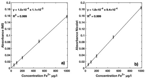 For both instruments, the absorbance was found to vary linearly with increasing iron concentration in the standard solutions. Both instruments presented R2 = 0.999, indicating a good correlation between Fe2+ concentration and measured absorbance. The slope of linear regression for the IMS is 1.5 × 10−4 with an intercept of 1.1 × 10−3, while the slope for the Nicolet Evolution 300 is 1.8 × 10−4 with an intercept of 9.4 × 10−4.