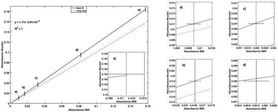 The unity line in the plot on the left in Figure 11 highlights the overestimation of 14.6% compared with the absorbance values measured with the Nicolet Evolution 300.