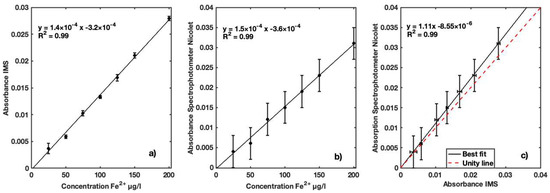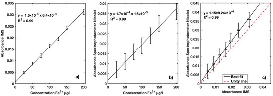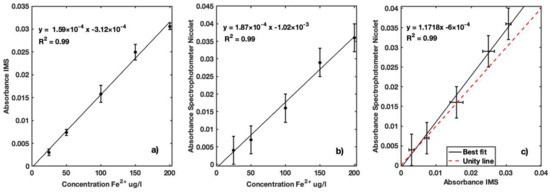 (a) Calibration curve of Fe2+ for IMS instrument for natural freshwater samples collected in a dam in concentrations ranging between 25 and 200 µg/L; (b) calibration curve of Fe2+ for same sample concentrations for reference Nicolet Evolution 300 spectrophotometer; (c) best fit of absorption coefficients measured with the two instruments for performance comparison.