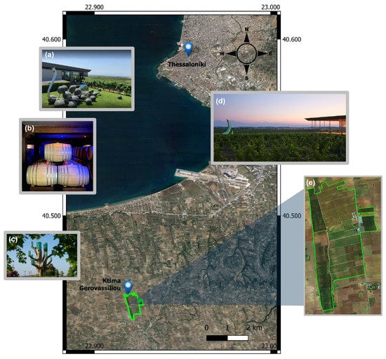 The pilot area of Ktima Gerovassiliou, located in Northern Greece. The sub figures (a–d) depict different views of the vineyard with its unique and special architecture while sub figure (e) presents the total cultivated area.