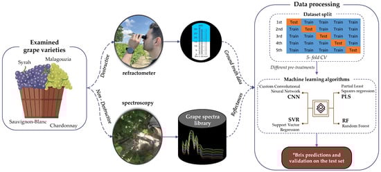 A graphical representation of the experimental procedure adopted in the current work is provided in Figure 2. In essence, the sampling procedure with both a refractometer and a spectroscopy sensor in the four different grape varieties was the initial step from where the ground truth data (including the grape spectral library) were collected. After the establishment of the grape spectral library, the regression models were developed. It is important to note that in the modeling stage, we conducted our analysis for each grape variety independently. By using the 5-fold cross-validation (CV) technique to split the dataset to training and test sets and through the application of machine learning algorithms, the final sugar content values could be estimated from the spectral data.
