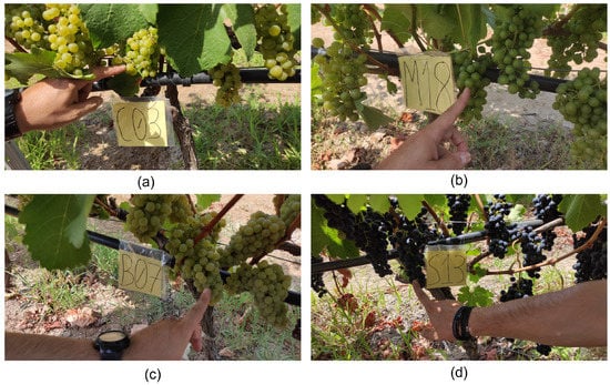 Labeled bunches in the four different examined varieties (a) Chardonnay, (b) Malagouzia, (c) Sauvignon-Blanc, and (d) Syrah.