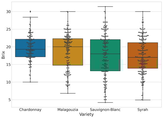 Box plot (overlaid with a swarmplot) of the °Brix content across the four different grape varieties; outlying values are denoted with a diamond shape.