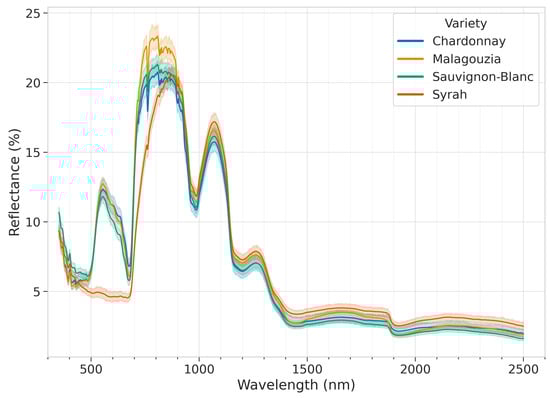 Mean spectrum (with confidence interval) of the reflectance spectra per each variety.