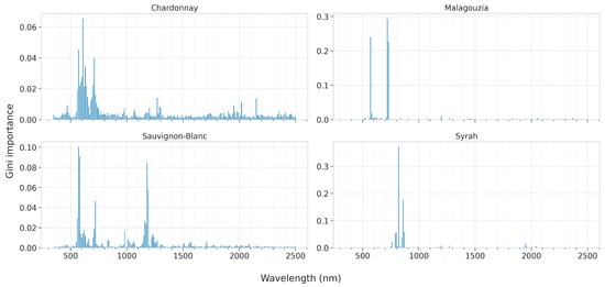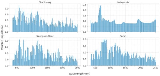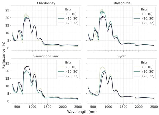 How the grapes’ spectral signatures are affected as they grow more mature (i.e., with higher °Brix content) is shown in Figure 7. An important point that arises from this figure is that the valuable information pertaining to the maturity of the grapes according to all spectral signatures focuses on the range from 550 to 1300 nm, whereas most of the SWIR appears to provide limited information in terms of absorption bands. At least in terms of the mean spectra, it is possible to visually identify some patterns that indicate a transition from low to higher sugar content; e.g., for Chardonnay and Malagouzia at 680 nm and for Syrah from 700 to 900 nm. Things are more convoluted for Sauvignon-Blanc, where the mean reflectance curve for the higher sugar content is found in between the respective curves for low and medium content. Yet even in this case, there is a visible absorption band at approximately 750 nm that increases for higher sugar content values. This indicates that by using spectral pre-processing techniques it may be possible for an apt learning algorithm to discern a more robust pattern and infer the sugar content from the spectral data.