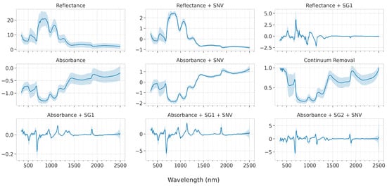 The effect of the various pre-treatments on the mean spectra (across all varieties); the shaded area indicates the standard deviation.