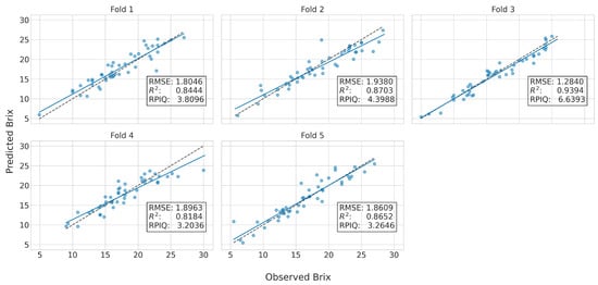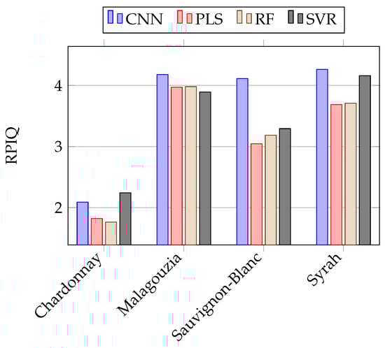 The mean prediction of accuracy across the five-folds in the independent test set is given in Table 3. Therein we present for each model the best spectral pre-treatment, which was determined as the one that minimized the mean RMSE in the internal validation sets. To aid the reader in the comparison, Figure 9 provides a visual comparison of the RPIQ values. The optimal set of hyperparameters corresponding to those results is provided in Table A1. Additionally provided in Figure 10 are the predictions of the CNN model using the Ref+SG1 spectra for the Syrah variety in the independent test set (i.e., the best model); the respective results of Table 3 are the mean metrics calculated across the five-folds. It is thus visible that there are some slight variations across the folds, which justifies our selection to use a five-fold cross-validation strategy to provide more robust comparisons.