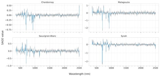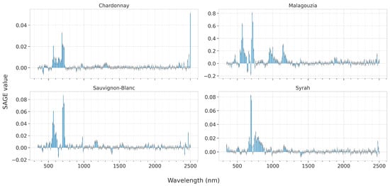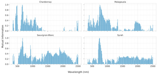 We applied an interpetability analysis on two levels: pre-hoc (i.e., before model development) and post-hoc (i.e., after model development). With respect to the first level, the mutual information [43] between the input (spectral data) and the output (°Brix) was calculated in the original reflectance space for each grape variety. The mutual information between two random variables is a non-negative value, quantifying the dependency between the variables; a zero value indicates that the two random variables are independent, while higher values suggest a higher dependency between them.
