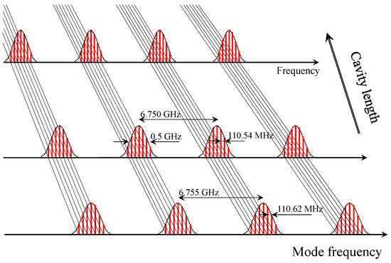 Laser cavity length dependence of the comb produced by the nested design depicted in Figure 1. For a particular cavity length (of the order of 2.71 m), laser cavity modes with a spacing of 110.62 MHz are identified (bottom of the figure). This structure repeats periodically every 6.755 GHz, a frequency that is sightly smaller than the etalon mode spacing of 6.821 GHz, since the etalon is 15.12 cm long with an index of 1.4534 at 20C. As the laser cavity length is increased, all mode spacings shrink in the same proportion.