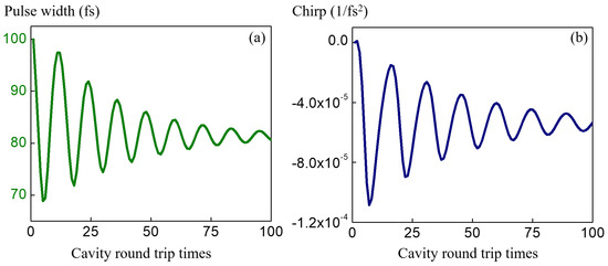 ABCD time transfer matrix method is applied to simulate single pulse (Ti:Sapphire cavity alone) circulating in the cavity. The convergence of the (a) pulse width and the (b) chirp coefficient are showing the compensation of the self phase modulation and dispersion in a stable time cavity.