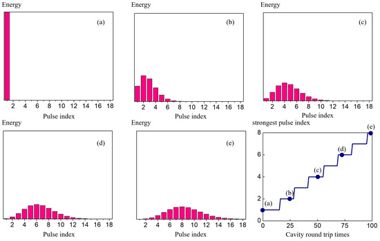 In Figure 5a–e, for easier visualization, column plots are used to show the energy in column height and shapes and widths of the pulses are discussed in Figure 6. The horizontal axis is the index of the pulses. Panel (a) shows the initial condition where only a single pulse exists in the cavity. During the 100 roundtrip propagations, only the first 18 pulses show significant change in their energies. As the number of roundtrips increase, the concentration of the energy is pushed forward to the pulses with higher indices. The evolution of the pulse bunch can be seen from panels (a)–(e), and once the envelope is formed, it travels at the bunch envelope velocity. The lower right panel plots out the index of the pulse where it has the maximum energy during propagation, which corresponds to the peak of the bunch. The bunch envelope speed can be calculated by finding the slope of the blue solid line.