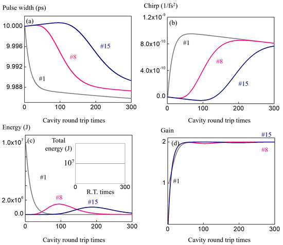 The dynamics of the individual pulses under the bunch enveloped is presented in Figure 6. Four panels are plotted in the same format as in the single pulse scenario in Figure 4 for comparison. During the first 100 roundtrips, only 18 of pulses are involved. For the sake of clarity, only the first (number 1), the middle (number 8), and the last (number 15) pulses inside the bunch envelope are presented, where distinct characteristics are observed. During the first 100 roundtrips, the first few pulses contain most of the energy, which help to balance the negative dispersion by stronger self-phase-modulation. On the other hand, the pulses with higher index temporarily see an unbalanced time transfer matrix, which induces broadening in width and accumulation of chirp. As the pulse bunch travels, the first few pulses lose their energy and see the unbalanced matrix, and for the higher index pulses such as number 8 and 15, their higher intensity start to help balance the negative dispersion. An apparent reversal of the slopes for number 8 and 15 can be seen at roundtrips higher than 100. In Figure 6c, the transfer of energy between pulses can be seen, which also supports the interpretation of balanced and unbalanced self-phase modulation matrices. The inset shows the energy sum of all the pulses, which is constant because of the loss free nature. The constant shape of the pulse bunch can be explained by the stabilization of the gain for all the pulses as shown in the Figure 6d. The overall propagation can be described as quasi-stable, where the pulse envelope is developing into a constant shape, while the individual pulses evolve and cycle from unbalanced, balanced, and to unbalanced again in time.