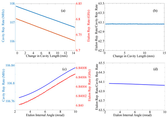 (a) Plot of the repetition rate of a single pulse within the nested etalon (blue line) and that of the pulse bunch in the larger cavity, as function of the laser cavity length. (b) Ratio of the two frequencies. (c) Plot of the two repetition rates of the parent cavity and the etalon taken simultaneously while the angle of the nested etalon is scanned. (d) Ratio of these two frequencies.