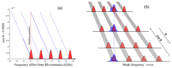 The dependence of the mode frequency on the etalon angle is depicted in Figure 9. The fluorescence of the D line of Rb is used as frequency reference. As expected, for a Fabry–Perot, its resonance frequency varies linearly with the cosine of the internal angle . Different modes of the Fabry–Perot come into resonance as the angle of the Fabry–Perot is increased (Figure 9a). When the individual laser modes are recorded, the picture that emerges is that sketched in Figure 9b. All modes change proportionally, such that lines connecting corresponding modes converge.