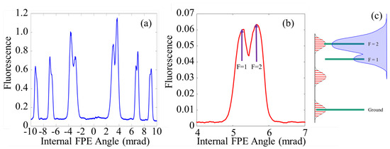 In this subsection, the resolved modes of Figure 3 are used to excite Rb fluorescence. By changing the angle of the Fabry–Perot etalon, the optical modes are scanned over the Rb vapor, and fluorescence peaks appear as shown in Figure 10a. Each time a fluorescent peak occurs, only a single Fabry–Perot mode is interacting with the atoms, though many frequency modes associated with the parent cavity are involved. Each time a resonance is achieved, the optical spectrum is reproduced. That is to say, for each peak in Figure 10a, the same optical spectrum is observed. Figure 10b shows the first order peak zoomed in. The wavelength value of the peaks identified as F = 1 and F = 2 are known via the notes of Dr. Daniel Steck [27] which contain the values of the frequency separation between the excited states of Rb as well as a tabulation of the coupling coefficients of the F = 1 and F = 2 lines.