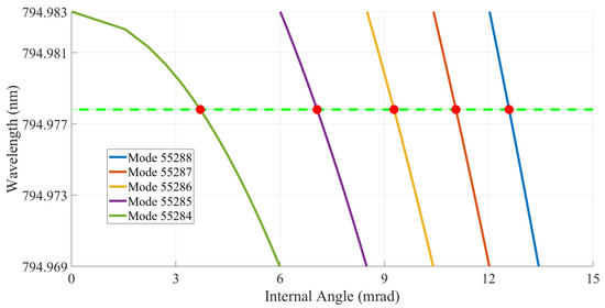 The red points are plotted to mark the angle at which each etalon mode coincides with the resonance line of Rb D1 line F = 2 state. This calculation is done for a room temperature corresponding to 23.4 °C. These points directly aligned to the F = 2 fluorescence peaks in Figure 10a. The plotted curves depict the frequency sweep of each etalon mode as the internal angle of the etalon is tuned. The green dashed line marks the value of the F = 2 resonance.