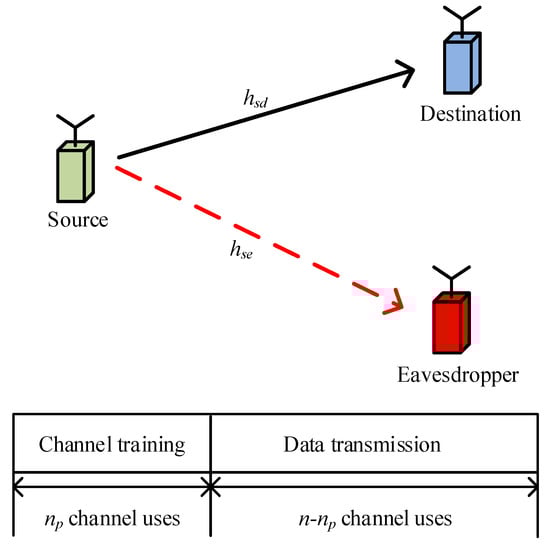 In this paper, we consider a secure short-packet communication system as shown in Figure 1, in which a source sends confidential short packets to a destination in the presence of a passive eavesdropper. Due to size limitation, each node is equipped with a single antenna. The channels from the source to the destination and the eavesdropper are subject to independent quasi-static Rayleigh fading, which means that the channel coefficients remain static during a coherence slot (n channel uses) and vary independently from one coherence slot to the next [,,].