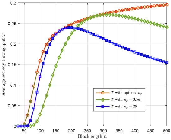 The average secrecy throughput T versus the blocklength n with , dB, dB, and dB, where the optimal channel training length is obtained without reliability constraint.
