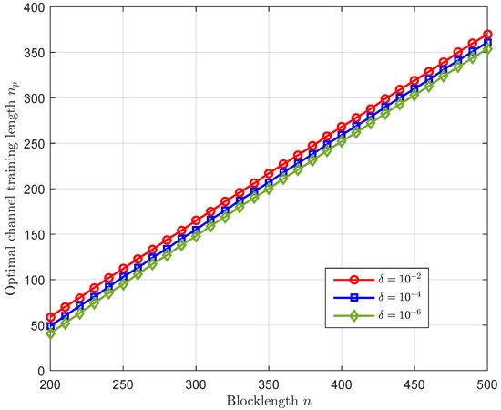 The optimal channel training length versus the blocklength n with , dB, dB, and dB, where the optimal channel training length is obtained without reliability constraint.