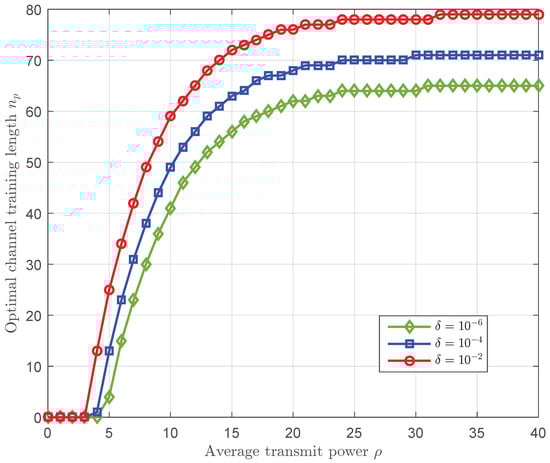 The optimal channel training length versus the average transmit power with , , dB, and dB, where the optimal channel training length is obtained without reliability constraint.