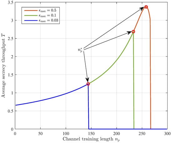 Figure 4 demonstrates that the optimal channel training length can significantly improve the average secrecy throughput of the considered system. To obtain comparable results, we provide the following channel training transmission schemes: (1) Fixed-ratio channel training length, in which the channel training length is fixed; (2) Fixed channel training length, in which the channel training length is fixed. It is clear that the average secrecy throughput with the optimal channel training is superior to the two benchmark schemes mentioned above, which implies that the average secrecy throughput of the considered system can be significantly improved via optimizing the channel training length.