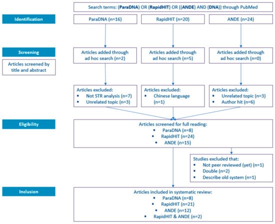 The results of the literature search, as described in Section 2.1, are depicted in Figure 2. The literature search in PubMed resulted in 16, 20, and 24 hits for the ParaDNA, RapidHIT, and ANDE systems, respectively. In the case of ParaDNA, two articles were added through ad hoc search, and for RapidHIT, this search resulted in five additional publications.