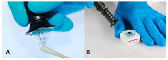 The ParaDNA Intelligence Test System has been developed by LGC (Laboratory of the Government Chemist, Teddington, UK). ParaDNA screens five STR loci (D3S1358, D16S539, D8S1179, D18S51, and TH01) and the sex marker Amelogenin [38]. The time-to-result of the ParaDNA system is 75 min, and this system is based on HyBeacons technology and melts curve analysis [39]. These beacons are made of short DNA sequences with one or more fluorescent dyes, which will emit light when the complementary DNA is attached to the beacon. The system consists of a screening unit, a sample collector, and a test kit [38,40]. The collector is used similarly to a swab; its head consists of four plastic tips (used for sampling of (potential) traces) (Figure 3). Post to sample collection, the head of the collector is inserted into a 4-well reaction plate [40].