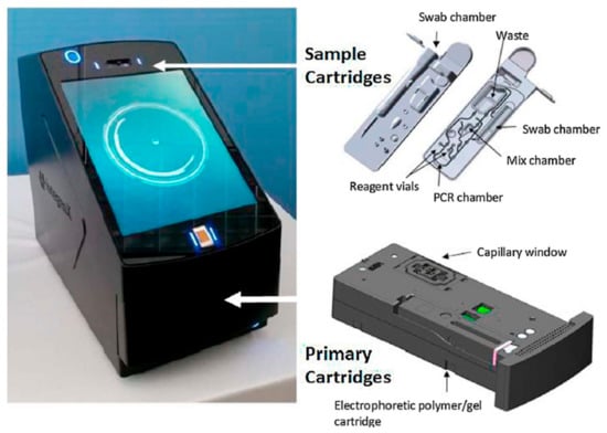The RapidHIT ID system from IntegenX with a primary cartridge (a reagent cartridge that contains the necessary reagents and consumables for capillary electrophoresis) and a sample cartridge [4]. Reprinted from Forensic Science International: Genetics, Copyright (2017), with permission from Elsevier.