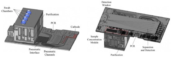 As already mentioned in the introduction, MiDAS is a microfluidic system for rapid forensic DNA analysis. In contrast to other rapid DNA analysis systems with all reagents present in the cartridge, MiDAS requires manual preloading of all reagents onto the cartridge. Moreover, other manual steps are required in the operation of the system, such as the installation of the CE chip. The system consists of a total of five interdependent modules: (1) swab lysis, (2) DNA extraction, (3) PCR, (4) PCR product transfer, and (5) CE separation, including optical readout [89]. Each module is discussed separately in various publications. The lysate was initially used as input, but after several improvements, the swab head could be used in combination with the swab sample lysis module [15]. After insertion of the swab in the module, lysis occurs. Then, the lysate is transported to a chamber for purification, amplification, and detection [90]. Hopwood et al. described a cartridge that integrates DNA extraction (from lysate), amplification, CE, and detection using laser-induced fluorescence (Figure 6). With this system, it is possible to obtain an STR profile within 4 h [14]. The PCR module is discussed by Estes et al. for the amplification of 17 STRs. This cartridge uses preloaded solid-phase reagents and paraffin valves for fluidic control [91]. The electronic control components, the CE microchip, and the optical detection module are described by Hurth et al. [16].