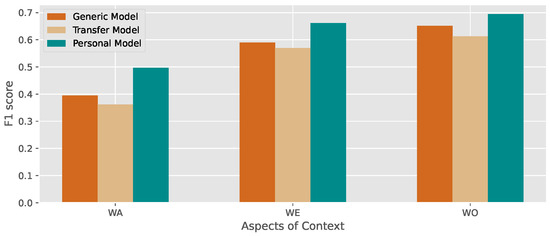 We use the five-fold cross-validation method in parameter searching and while training the models. We classify the activity annotations into three types, which are activities, locations, and social relations. The performances of the three types of activity are displayed in Figure 2, where each set of the bars represents the of recognizing the activity (blue bar), location (red bar), and social relation (green bar) for each individual. Results indicate that the personal model performs the best and the transfer model has the worst performance, which indicates that heterogeneity exists among individuals. This experiment shows that model personalization improves the performance in the activity recognition task in an open-world environment. Thus, using federated learning to learn features from multiple individuals and generating a model for each individual by meta-learning is a promising approach to account for inter-individual differences.