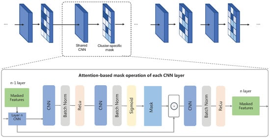 The detailed structure of the attention-based mask is shown in Figure 5, consisting of multiple convolutional blocks for extracting task-specific features. Specifically, we refer to the shared features in the l-th layer of the shared network as and the learned attention mask in this layer for individual u as . The task-specific features in this layer are then computed by element-wise multiplication of the attention masks with the shared features: