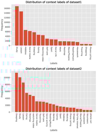 However, these HAR algorithms classify sensor data into one certain labeled activity, which provides limited information about humans for context-aware applications. Moreover, these HAR methods are not suitable for real-world problems since most of them are implemented in controlled environments. Therefore, the study and recognition of activity in the open world have drawn extensive attention in the area of ubiquitous computing. Ref. [35] collect labeled data of natural behavior using smartphone and smartwatch sensors in real-life settings and then recognize the activity of individuals in the wild. The work in [36] treats the task of activity recognition as a multi-label classification problem and uses MLP as the classifier, which improves accurate recognition with fewer parameters. Ref. [37] proposes a multimodel CNN model for fusing diverse modalities of sensor readings to learn behavioral activity. DeepContext [38], a CNN-based model for recognizing a user’s activity, applies an attention mechanism to discover and utilize important features of smartphone sensor readings. However, previous work has hardly considered multiple aspects of activity and studied the correlations between aspects of the activity.