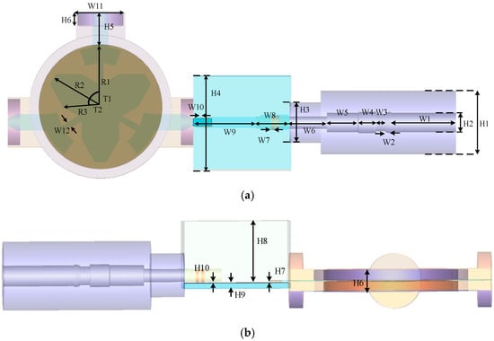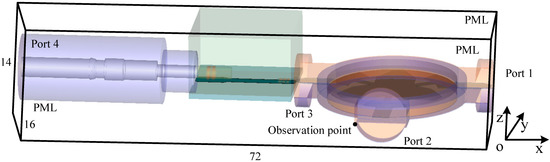 From Figure 1a, it can be observed that the satellite sensors system is composed of a circulator, transmission line, waveguide and connector from the left to the right. The circulator can be regarded as the patched component and is composed of the vertical magnetized ferrite material with the parameter of . The substrate of the ferrite is composed of Teflon dielectric plate with a parameter of . The patch on the top surface of the ferrite material is made up of the metal gold. Three ports are included in the circulator model which can be regarded as a combination of a circle with a radius of 4 mm and a rectangle of mm. The middle of the structure is the transmission line component with a metal connector. Inside the transmission line model, Rogers RO4003 with the parameter of 3.55 is employed as the substrate material. The bands which are located just above the substrate are also made up of metallic gold. The right side of the structure is the coaxial waveguide structure. Inside the waveguide model, Teflon dielectric bulk and metal center which can be expressed by the perfectly electronic conductor (PEC) are employed. The detailed parameters of the entire model are listed in Table 1 with the unit of a millimeter (mm).