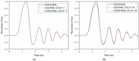 Through Figure 4a, it can be observed that these curves are almost overlapped. Such a condition indicates that these algorithms hold the same calculation accuracy with CFLN = 1. As shown in Figure 4b, curves show shifting compared with those obtained by CFLN = 1. The condition indicates the calculation accuracy degenerates with the enlargement of CFLNs. The reason is that the numerical dispersion increases with the enlargement of the time step, which results in the degeneration of calculation accuracy. Among unconditionally stable algorithms, it can be observed that the proposed CNDS-PML algorithm shows less shifting compared with the implicit ADI-PML scheme. Such a condition indicates the proposed algorithm behaviors less numerical dispersion and better accuracy compared with the existing implicit scheme.
