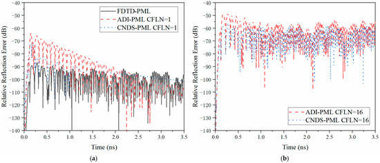 The relative reflection error obtained by different PML algorithms and CFLNs at the observation point in the time domain (a) FDTD-PML, ADI-PML and CNDS-PML with CFLN = 1. (b) FDTD-PML, ADI-PML and CNDS-PML with CFLN = 16.